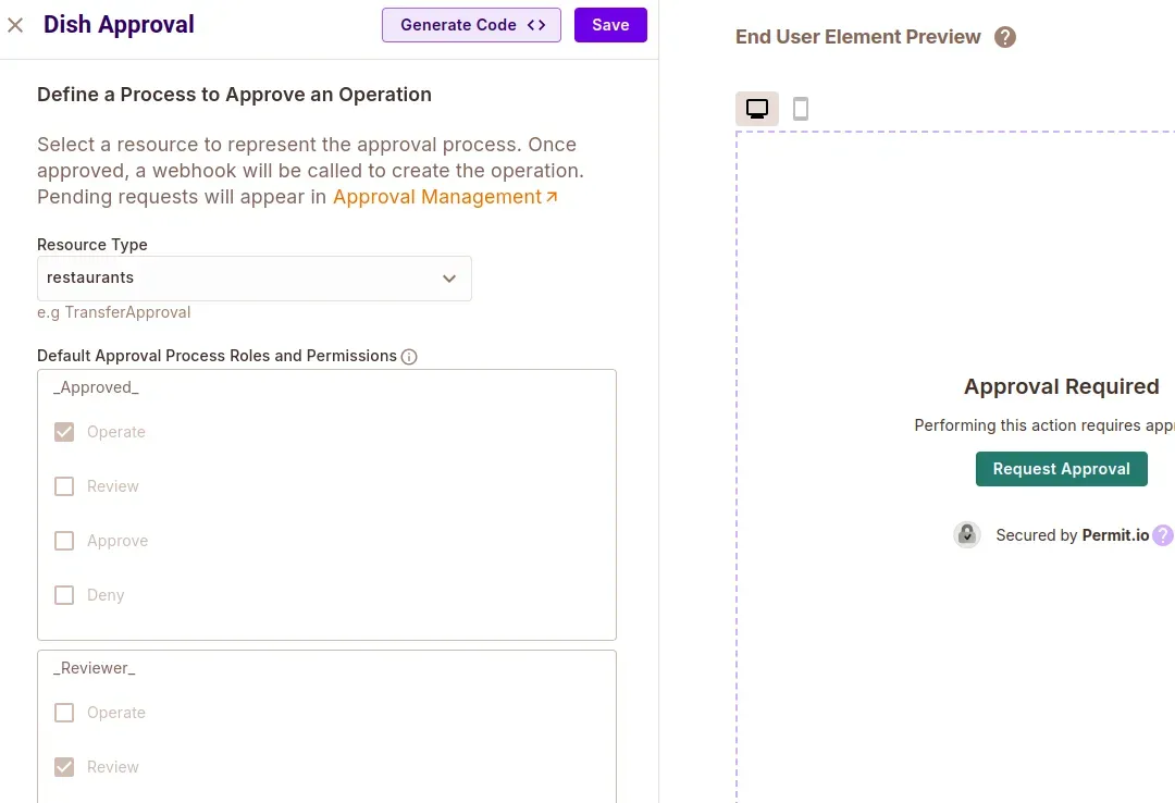 - Create a User Management Element for restaurant access requests with the following config: